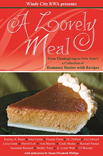 Curl up and feed your soul with A LOVELY MEAL. A collection of fourteen delicious novellas of romance and recipes that will be sure to leave you satisfied. From the sweet tastes of sugar cookies and kisses to the sensuous bite of vodka and mint, this collection has a flavor to please every appetite. Windy City RWA is proud to present A LOVELY MEAL. All proceeds will go to the Ovarian Cancer National Alliance. http://www.ovariancancer.org/ "A Lovely Meal features stories about finding love, forgiving love, and forgotten love all with a holiday theme. Also as a nice bonus, delicious recipes are included from each author". Mary Jo Burke, award winning author Savannah Reynard's "Echoes of Time" is a hauntingly beautiful story of love and second chances. Tom and Madison discover hope for their future while snowbound in a home filled with echoes of their past. "Thankful for Pie" by Julia Curtin was a delightful read complete with sweet treats and a simmering connection between Steve and Star. Loved the mystery angle and the strength of family in this story. A read to be truly thankful for!" – Nicole Leiren, author of MORE THAN ONE NIGHT Savor several types of romantic stories from humorous contemporary to paranormal from: Katrina A. Bauer, Julia Curtin, Dyanne Davis, J.C. DePaul, Cici Edward, Livia Grant, Sherrill Lee, Ann Macela, Cindy Maday, Rachael Passan, Savannah Reynard, Shelley Tracy, A. Lynne Wall and C.J. Warrant. Windy City RWA founding member Cathie Linz inspired this group of authors, including new and experienced writers, to pen this collection in her memory. With a dedication from NYT bestselling author Susan Elizabeth Phillips, Cathie's memory is carried through the stories, including references to her favorite red boots. Warm your heart - and your stomach - with this delicious collection, and benefit a great cause!